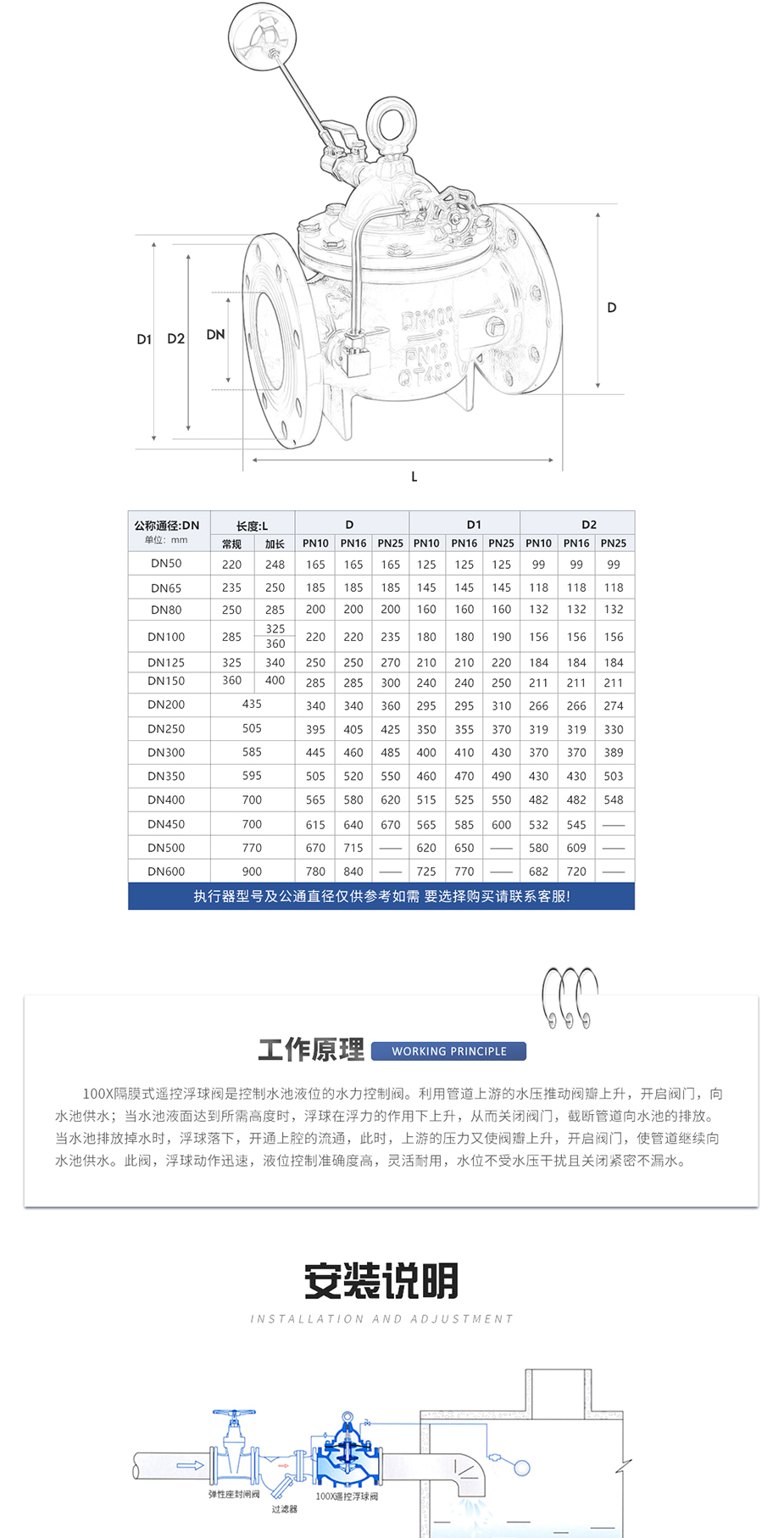 100X遙控浮球閥由主閥、針閥、球閥、浮球閥、微型過濾器等組成水力控制接管系統,調定后,自動控制液面高度。100X遙控浮球閥直接利用液面控制,不需要其它裝置和能源,保養簡便,液面控制準確度高,不受水壓影響,密封可靠。100X遙控浮球閥廣泛用于高層建筑、生活區等供水管網系統的水塔、水池等設施的液面控制。